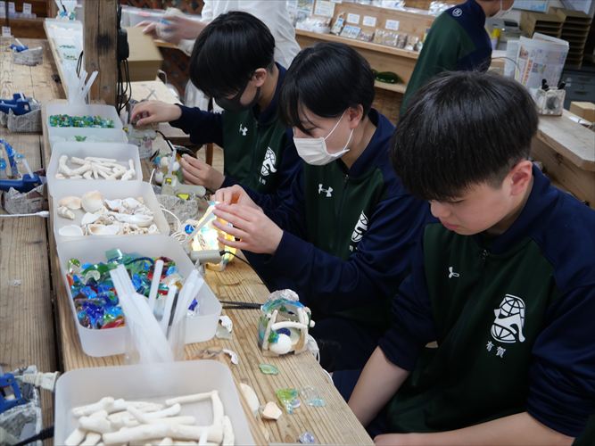 マリン体験が悪天候の為、中止となってしまい、代替えでライトづくりを行いました。貝殻やビーチグラスをグルーガンで貼り付け、一人ひとりが創意工夫して世界に一つしかないライトをつくりました。