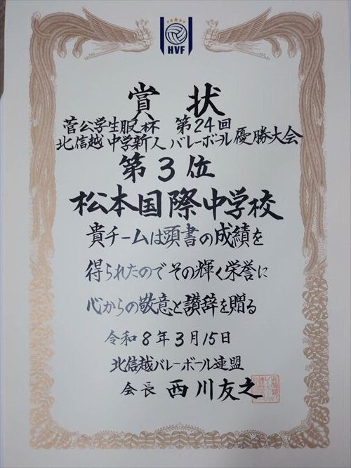 女子バレーボール部が 3月14日(土)15日(日)ANCアリーナで開催された「菅公学生服杯 第24回北信越中学新人バレーボール優勝大会」に出場し、第3位の結果を残すことができました。引き続き応援宜しくお願い致します。